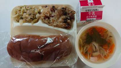 本日の献立は、金時豆の中華おこわ、ツナと野菜のオイスターソース炒め、中華スープ、黒糖パン、牛乳です。
