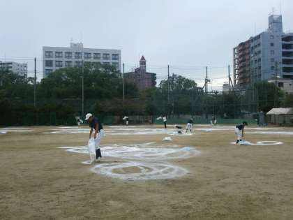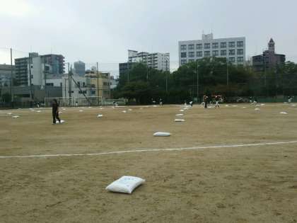 さて、午後から運動場では塩化マグネシウム(苦汁)まきが行われています。