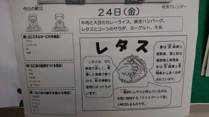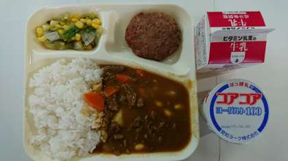 本日の献立は、牛肉と大豆のカレーライス、焼きハンバーグ、レタスとコーンのサラダ、牛乳、ヨーグルトです。