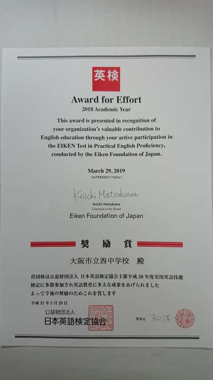 全校集会で、代表して、3年生の近藤くんに賞状を受け取ってもらいました。