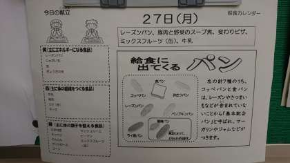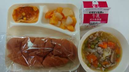 本日の献立は、変わりピザ、豚肉と野菜のスープ煮、レーズンパン、牛乳、ミックスフルーツ(缶)です。