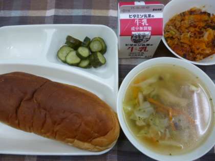 本日の献立は、黒糖パン、じゃがいものミートグラタン、スープ、きゅうりのピクルス、牛乳です。