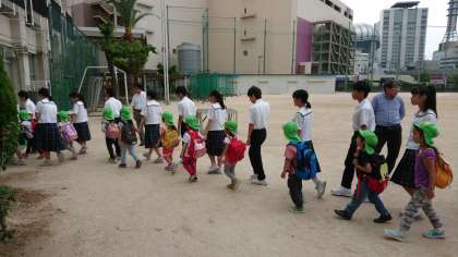 「地震による津波を想定した避難訓練」ですので、いったん運動場に避難したのち、津波を想定して再度3階以上に避難します。