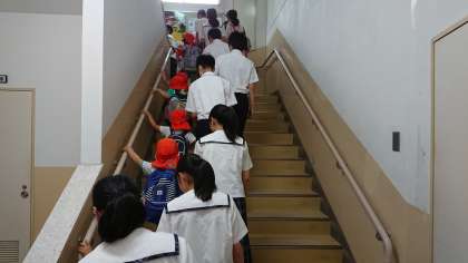 2年生のみなさんは、一人一人、西保育所の園児たちと手をつないで、4階のLL教室まで避難します。