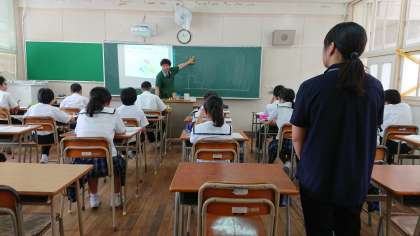 3時限目 1年1組 技術科 吉村教諭の「第三角法による正投影図」の作図の授業です。