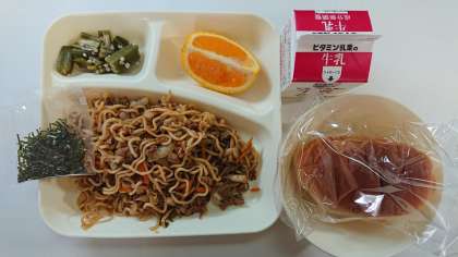 本日の献立は、焼きそば、オクラのかつお梅風味、黒糖ロールパン、牛乳、オレンジです。