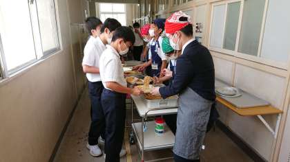 今日も、教育実習の先生が子どもたちと一緒に配膳をしてくださっています。