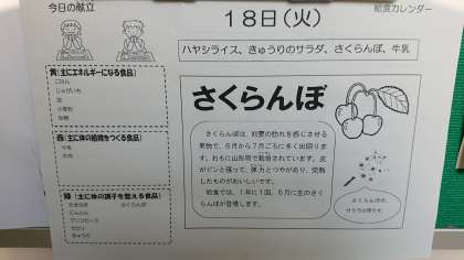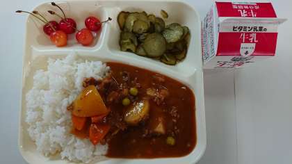 本日の献立は、ハヤシライス、きゅうりのサラダ、さくらんぼ、牛乳です。