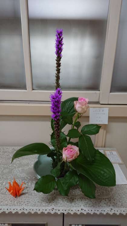 花材は、リアトリス、バラ、ギボシです。