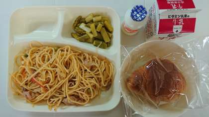 本日の献立は、ポークトマトスパゲッティ、グリーンアスパラガスのサラダ、黒糖ロールパン、発酵乳、牛乳です。