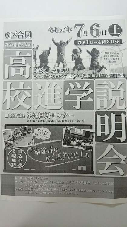 7月6日(土)午後1時〜4時30分まで、浪速区民センターにおいて「6区合同 高校進学説明会」が開催されます。