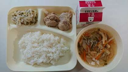 本日の献立は、鶏肉の醤油マヨネーズ焼き、切り干し大根のゆずの香あえ、五目汁、ごはん、牛乳です。