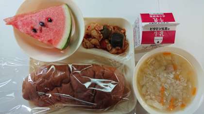 本日の献立は、鶏肉と夏野菜のソテー、押し麦のスープ、黒糖パン、牛乳、すいかです。
