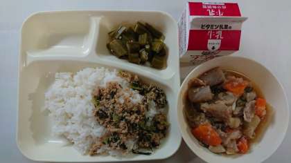 本日の献立は、豚肉とじゃがいもの煮物、オクラの甘酢あえ、ツナッ葉炒め、ごはん、牛乳です。