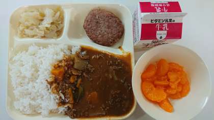 本日の献立は、夏野菜のカレーライス、焼きハンバーグ、キャベツのサラダ、みかん(缶)、牛乳です。