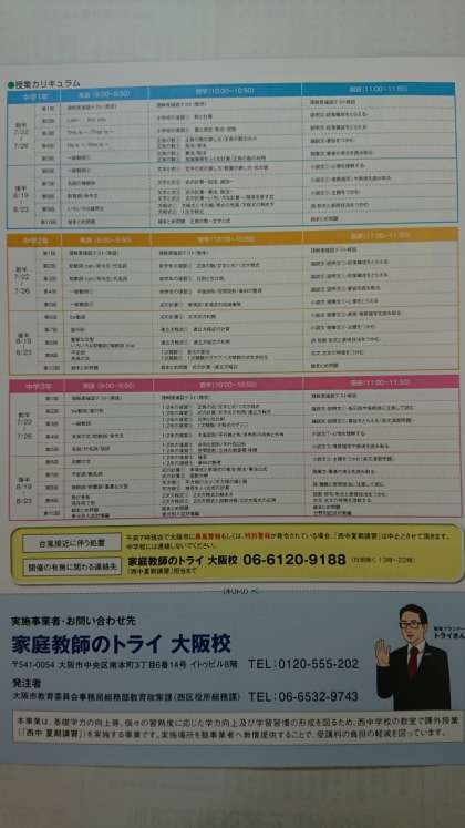 申込用紙を提出した生徒は、7月22日(月)9時に、制服で、各学年1組の教室に筆記用具を持って登校してください。(「塾代助成カード」を持っている生徒は、持ってきてください。)