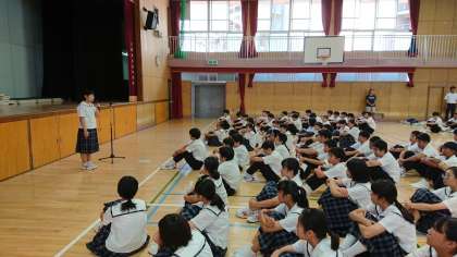 まず、生徒会長の3年1組浜田さんから「生徒会選挙公示」についてのお知らせがありました。
