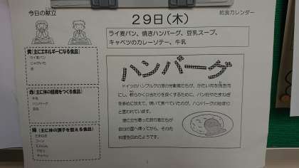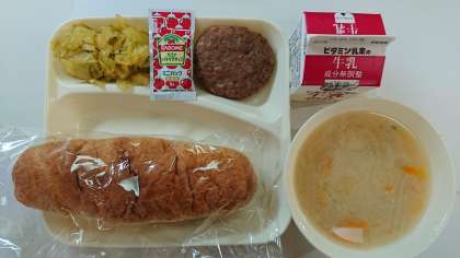 本日の献立は、焼きハンバーグ、キャベツのカレーソテー、豆乳スープ、ライ麦パン、牛乳です。