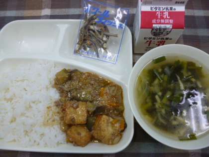 本日の献立は、マーボー厚揚げ丼、中華スープ、ミニフィッシュ、牛乳です。