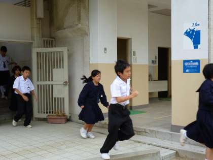 サイレンがなってから運動場に避難完了するまで4分44秒でした。