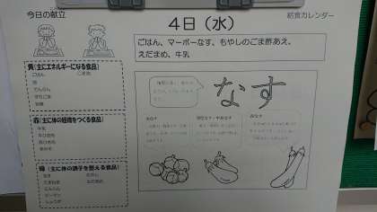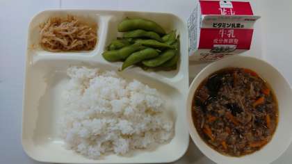 本日の献立は、マーボー茄子、もやしの胡麻酢あえ、枝豆、ごはん、牛乳です。