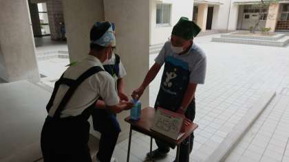 給食当番の生徒は、食中毒予防のため、配膳前に、しっかりとアルコール消毒をしています。