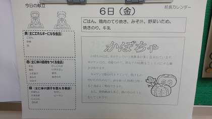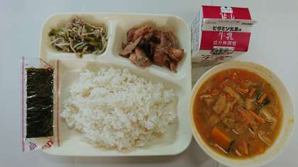 本日の献立は、鶏肉の照り焼き、野菜炒め、味噌汁、ごはん、焼き海苔、牛乳です。