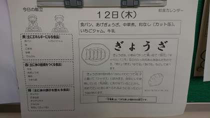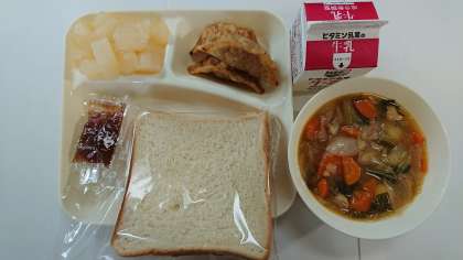 本日の献立は、揚げ餃子、中華煮、和梨(カット缶)、食パン、苺ジャム、牛乳です。