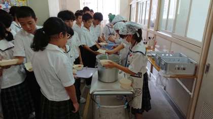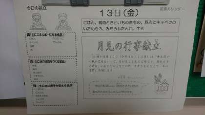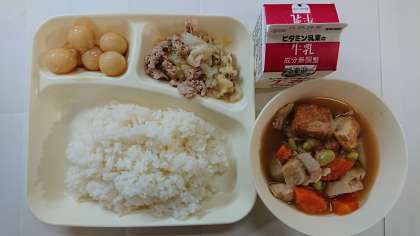 本日の献立は、鶏肉と里芋の煮物、豚肉とキャベツの炒め物、みたらし団子、ごはん、牛乳です。