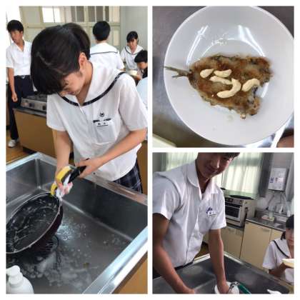本日の2年3組の家庭科では「イワシのパン粉焼き」の調理実習を行いました。
