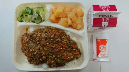 本日の献立は、大豆入りキーマカレーライス(米粉)、グリーンサラダ(ノンエッグドレッシング)、白桃(カット缶)、牛乳です。