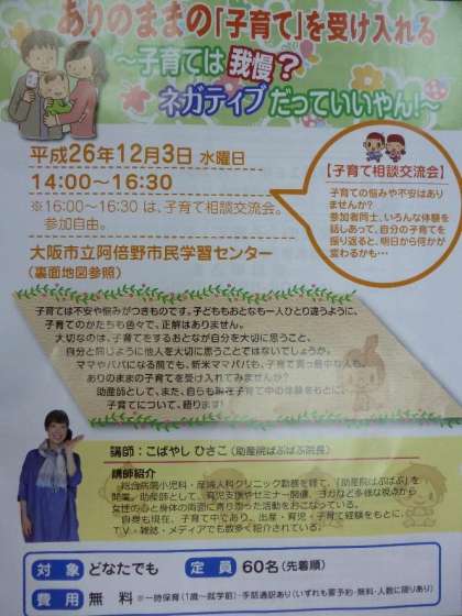 大阪市教育委員会事務局 生涯学習部より、平成26年12月3日(水)に行われる、子育てに関する相談交流会のご案内です。