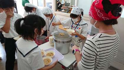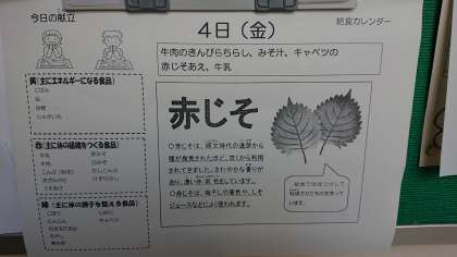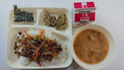 本日の献立は、牛肉のきんぴらチラシ、キャベツの赤じそあえ、味噌汁、牛乳です。