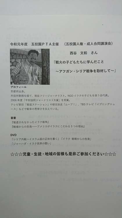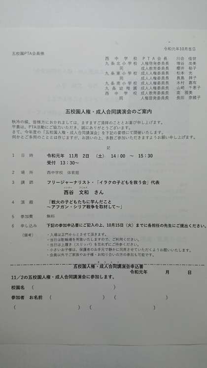 「五校園人権・成人合同講演会」のご案内を配付しています。