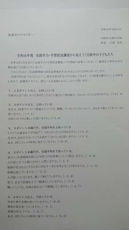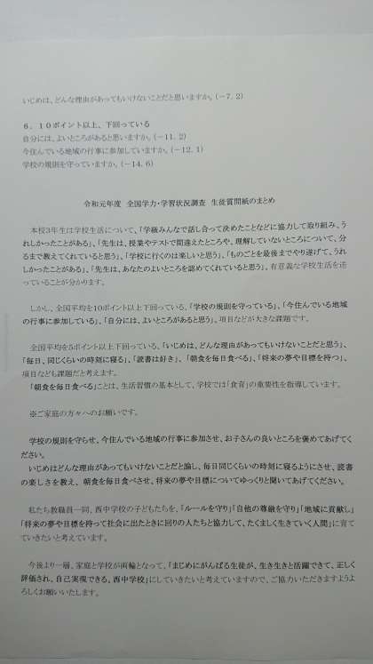 「令和元年度 全国学力・学習状況調査から見えてくる西中の子どもたち」を配付しています。
