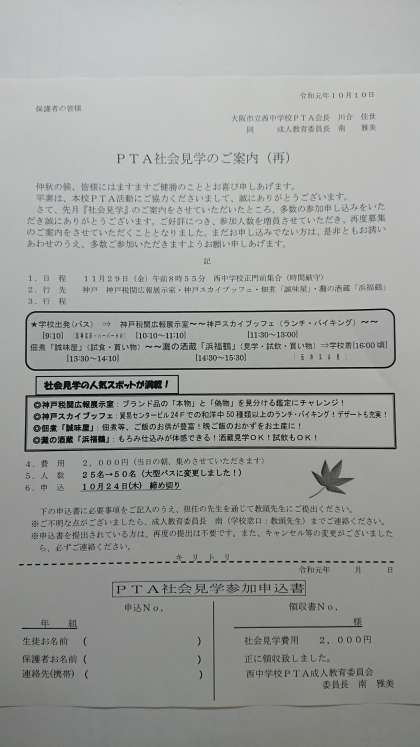 再度、「PTA社会見学のご案内」を配付しています。