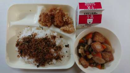 本日の献立は、鶏肉の竜田揚げ、厚揚げと野菜の煮物、おかか菜っ葉、ごはん、牛乳です。