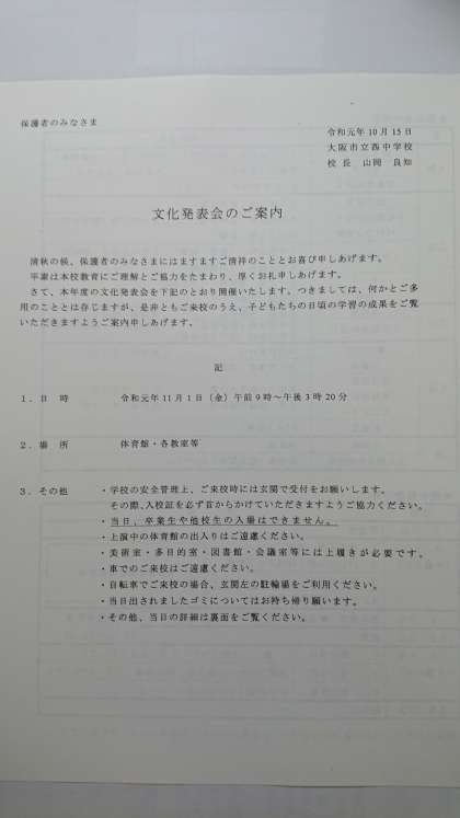 「文化発表会のご案内」を配付していますので、お誘いあわせのうえ、ぜひご来場くださいますようお願いします。