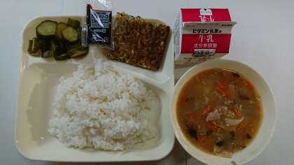 本日の献立は、お好み焼き、きゅうりの甘酢あえ、豚汁、ごはん、牛乳です。