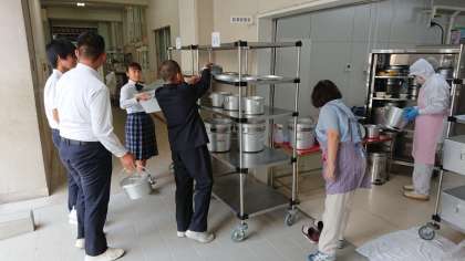 後期の給食当番が、さっそく後片付けのお手伝いをしてくれています。