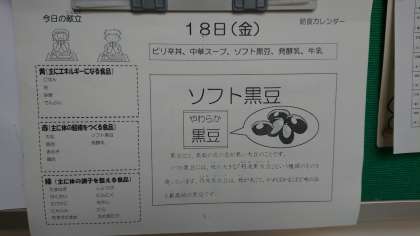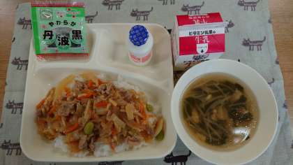 本日の献立は、ピリ辛丼、中華スープ、ソフト黒豆、発酵乳、牛乳です。