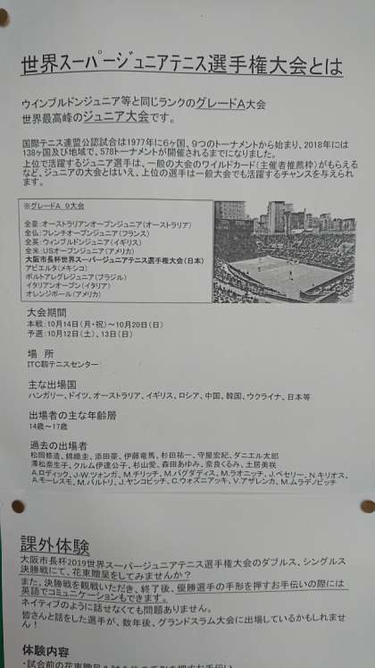 10月19日(土)20日(日)の2日間、本校卒業生と3年生が、靭テニスセンターにおいて開催された「世界スーパージュニアテニス選手権大会」での「課外体験」に参加しました。