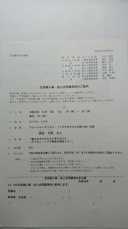 明日11月2日(土)14時〜15時30分まで、西中学校体育館において、「五校園人権・成人合同講演会」を開催します。
