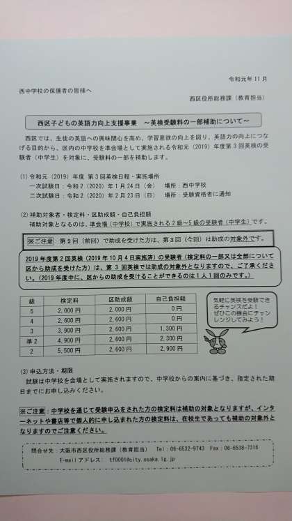 前回、西区から検定料の助成を受けなかった生徒は、今回助成を受けることができますので、ぜひ受検してください。