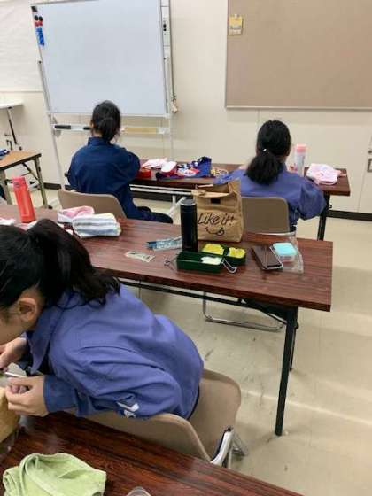 おしぼり班と紙器加工班に分かれて実習を行っています。