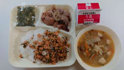 本日の献立は、鮭と小松菜のご飯、豚肉と蓮根の甘辛焼き、冬野菜の味噌汁、牛乳です。