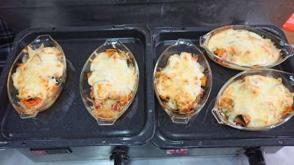 2年3組は、給食の野菜たっぷりケチャップ煮にプラスして、調理実習の野菜グラタン付きです。