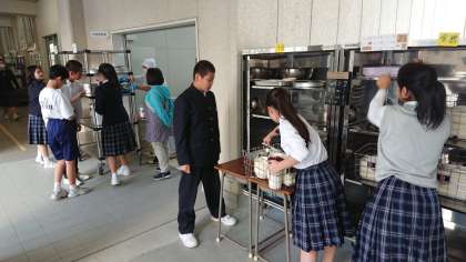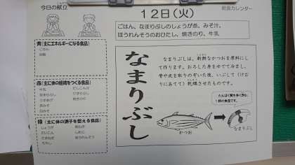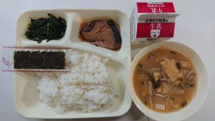 本日の献立は、なまり節の生姜焼き、ほうれん草のおひたし、味噌汁、焼き海苔、ごはん、牛乳です。