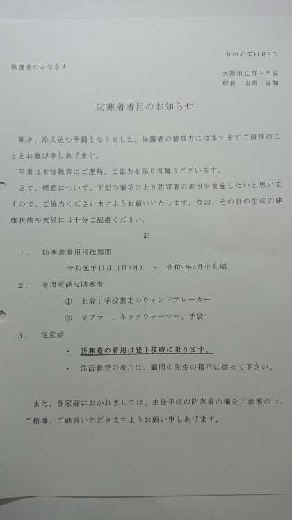 「防寒着着用のお知らせ」を配付していますので、ご確認ください。