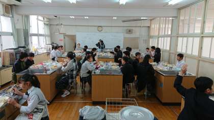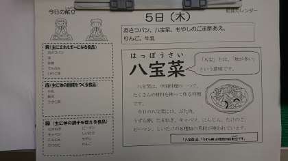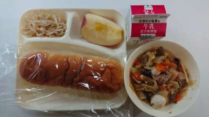 本日の献立は、八宝菜、もやしの胡麻酢あえ、おさつパン、りんご、牛乳です。